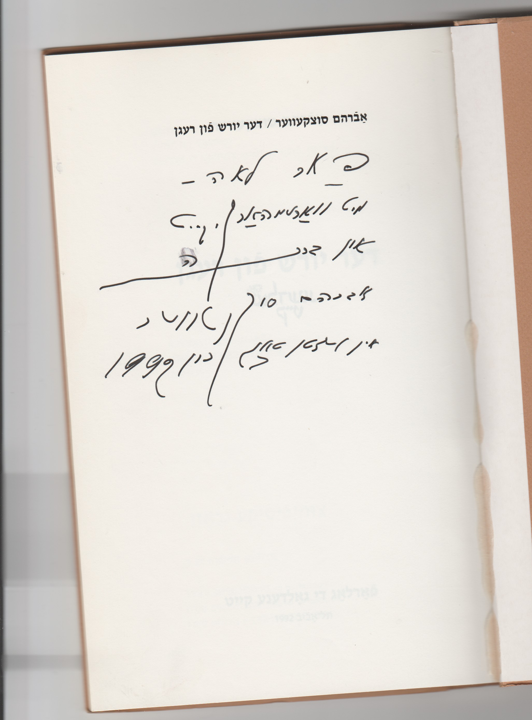 און צום סוף: סוצקעווער האָט אין ישׂראל אַרויסגעגעבן 30 ביכער פּאָעזיע, צוויי פֿון זיי האָב איך געהאָט די זכיה צו באַקומען פֿון אים פּערזענלעך מיט זײַן אונטערשריפֿט. אָט זעט איר זיי.