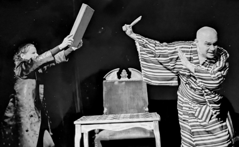 אָדער נעמט טאַקע דעם פֿאָכער… אין די הענט פֿונעם אַקטיאָר ווערט דער פֿאָכער אַ געשטאַלט פֿאַר זיך — אָט איז ער אַ שירמע צו פֿאַרשטעלן דעם ליגן און חניפֿה פֿונעם שד, אָט אַ מחיצה, וואָס טיילט אָפּ דאָס ליכט פֿון פֿינצטער, לטובֿת דעם חושך; און אָט ווײַזט דער פֿאָכער אַרויס איינעם פֿון די צוויי צייכנס פֿאַרן טישעוויצער רבין, אַז דער שד איז נישט קיין שד, נאָר אַ „מלאך‟… ס׳איז דאָך טעאַטער! אין טעאַטער וואַרפֿט זיך דער אמת אין די אויגן.
