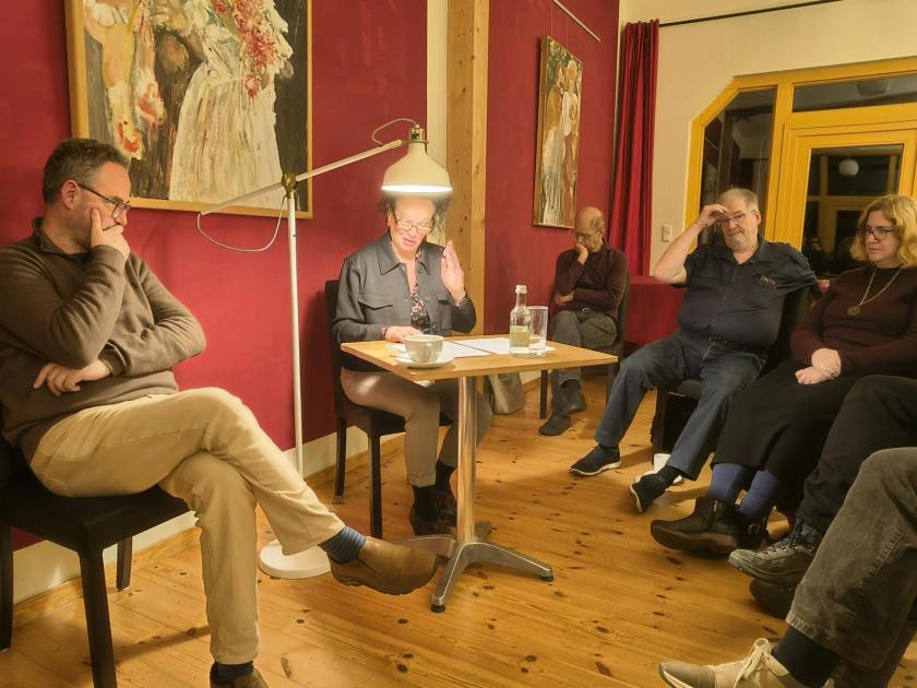 דער עולם האָט זיך אַרײַנגעשאַרט אין דער ביבליאָטעק-צימער צו ביסלעך. עס זענען געקומען אַן ערך דרײַסיק מענטשן זיך באַקענען מיטן אינערלעכן לעבן פֿון הערש גרינבערג: אַלטע ייִדן, איין פֿרוי איז געקומען קיין האַנאָווער פֿון בוקאַרעשט מיט פֿופֿציק יאָר צוריק, און איך האָב דורכגעלופֿטערט מיט איר מײַן רומעניש. עס זענען געקומען דײַטשן, אַ קורדישער בחור, אַן אָנהענגער פֿון מדינת-ישׂראל. איך האָב באַוווּנדערט דעם עולם. אַלע האָבן זיך מטריח געווען צו קומען אַהער אין אַ קאַלטן אָוונט, כּדי צו הערן, וואָס אַן אומבאַקאַנטער ייִדישער שרײַבער פֿון ישׂראל האָט צו זאָגן. דאָס איז נישט קיין קלייניקייט.